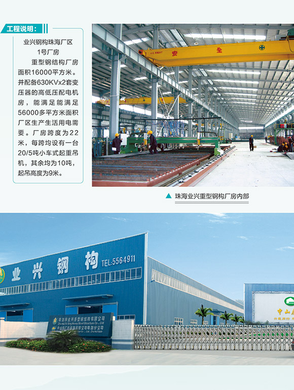 珠海市業(yè)興重型鋼構(gòu)有限公司(簡稱業(yè)興重鋼),是中山市廣興裝飾有限公司為提高鋼結(jié)構(gòu)制作等級和生產(chǎn)力,在珠海市投資建設(shè)的重型鋼結(jié)構(gòu)專業(yè)公司。本公司位于珠海市斗門區(qū)蓮洲鎮(zhèn)永利工業(yè)園,業(yè)興重鋼占地面積56000多平方米,目前第一期廠房面積16000多平方米,配備5、10、20/5噸多種吊車,并有超大構(gòu)件安裝的外場作業(yè)面積8000平方米,配備2組630KV變壓器及后備項目預(yù)留建設(shè)用地。